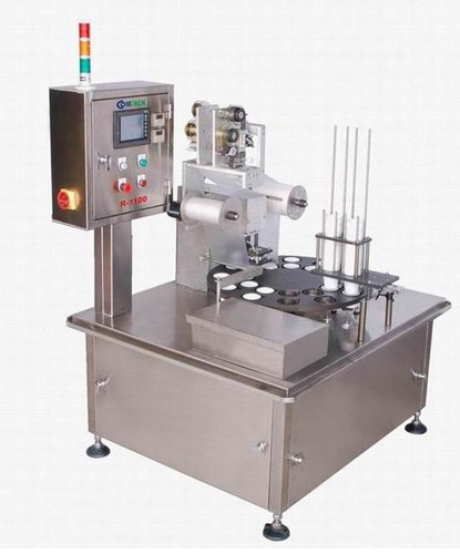 BG系列圆盘机功能齐全之最小型全自动化机种,佔用空间小。落杯→无杯检出→充填→电眼校正封膜位置→印字→封口&杯盖裁切→成品整列排出一贯作业。传统式操作面板,简单易懂。封口模独立温控回授控制。电眼自动追踪校正封口位置,薄膜印刷对位精确。全机採用不銹钢及铝合金制作,坚固平稳,永不生锈。充填定量精确,储料桶液位控制自动供料。CIP自动清洗料桶及充填管路。全部管路符合食品级卫生规范。无杯检出自动停机,补入自动启动。成品自动整列输出。
